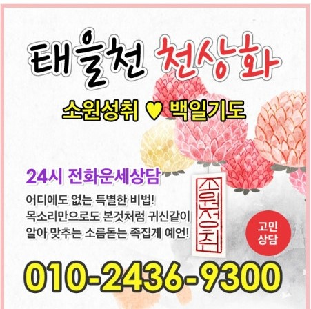 2019년 닭띠운세 소원성취 이루는 천상비결로 유명한 태을천 천광법사의전생업장 소멸과 조상영가 백일천도 공덕 정성을 통해답답하게 막혀있던 재물운이 시원하게 열려 큰 돈가 재물이 물밀듯이 들어오는 신기하고 행복한 경험을 하고 있습니다현 시대는 물질 만능주의 답게 능력이 있어야자신만의 소중한 사랑을 쟁취할 수 있습니다그 토록 원하고 바라는 꿈과 희망을 이룰 수 있는개개인별 특별비법을 전수 받아 원하고 바라는 소